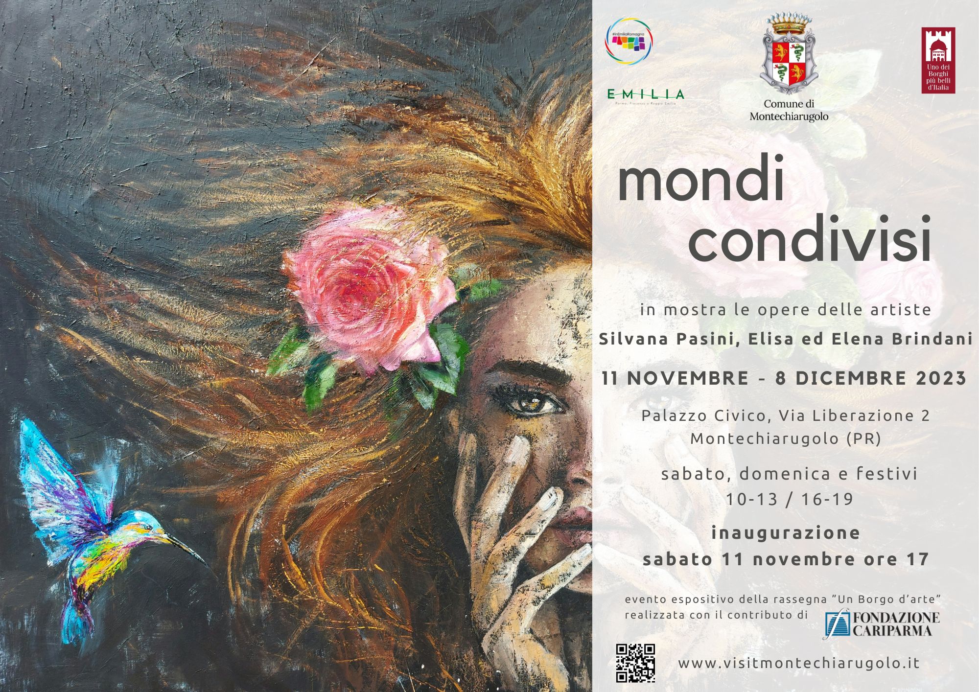"Siamo molto contenti di chiudere la rassegna "Borgo d'arte" valorizzando tre artiste del nostro territorio. "Mondi Condivisi" è infatti un'esposizione di quadri delle pittrici monticellesi Silvana Pasini, Elisa ed Elena Brindani, un percorso che racconta tre modi distinti di fare arte, tre sguardi diversi che muovono dallo stesso contesto familiare e che si intrecciano. Inoltre, "Mondi condivisi" coinvolgerà alcune classi del nostro Istituto comprensivo in laboratori artistici tenuti direttamente da Elisa Brindani, per far conoscere la potenza magica del colore e, al contrario, i segreti delle ombre e del chiaroscuro anche ai più piccoli." – Laura Scalvenzi, Assessore alla Cultura del Comune di Montechiarugolo